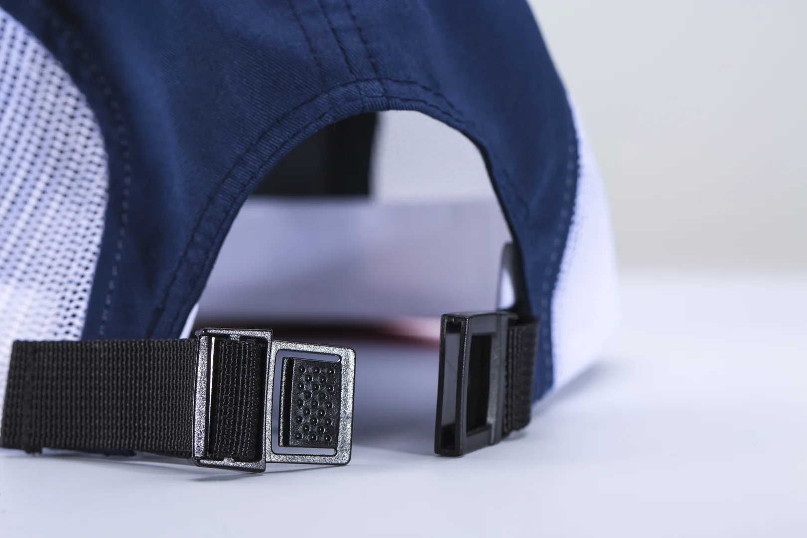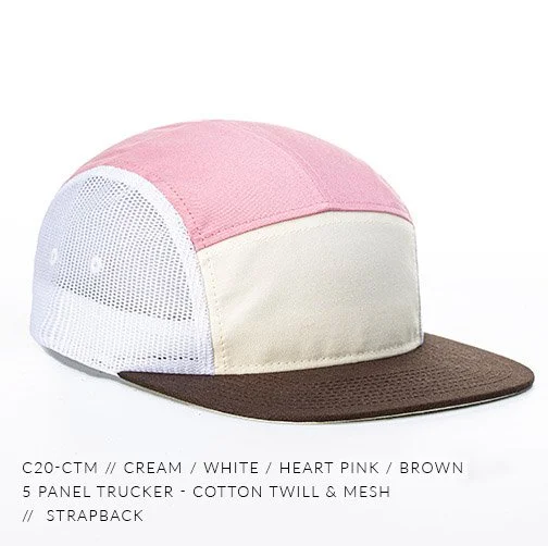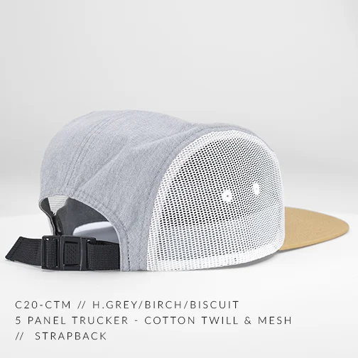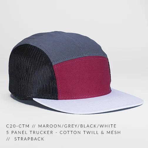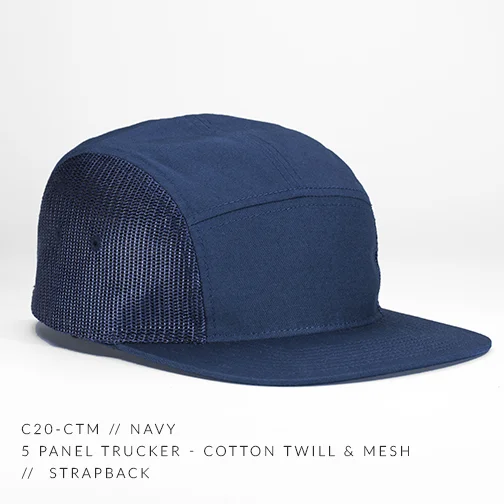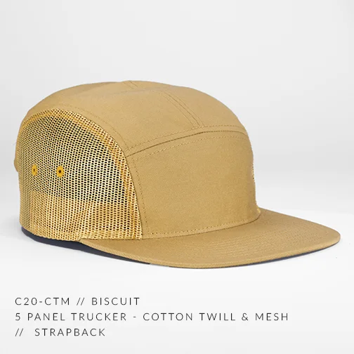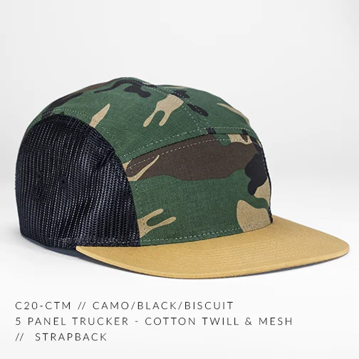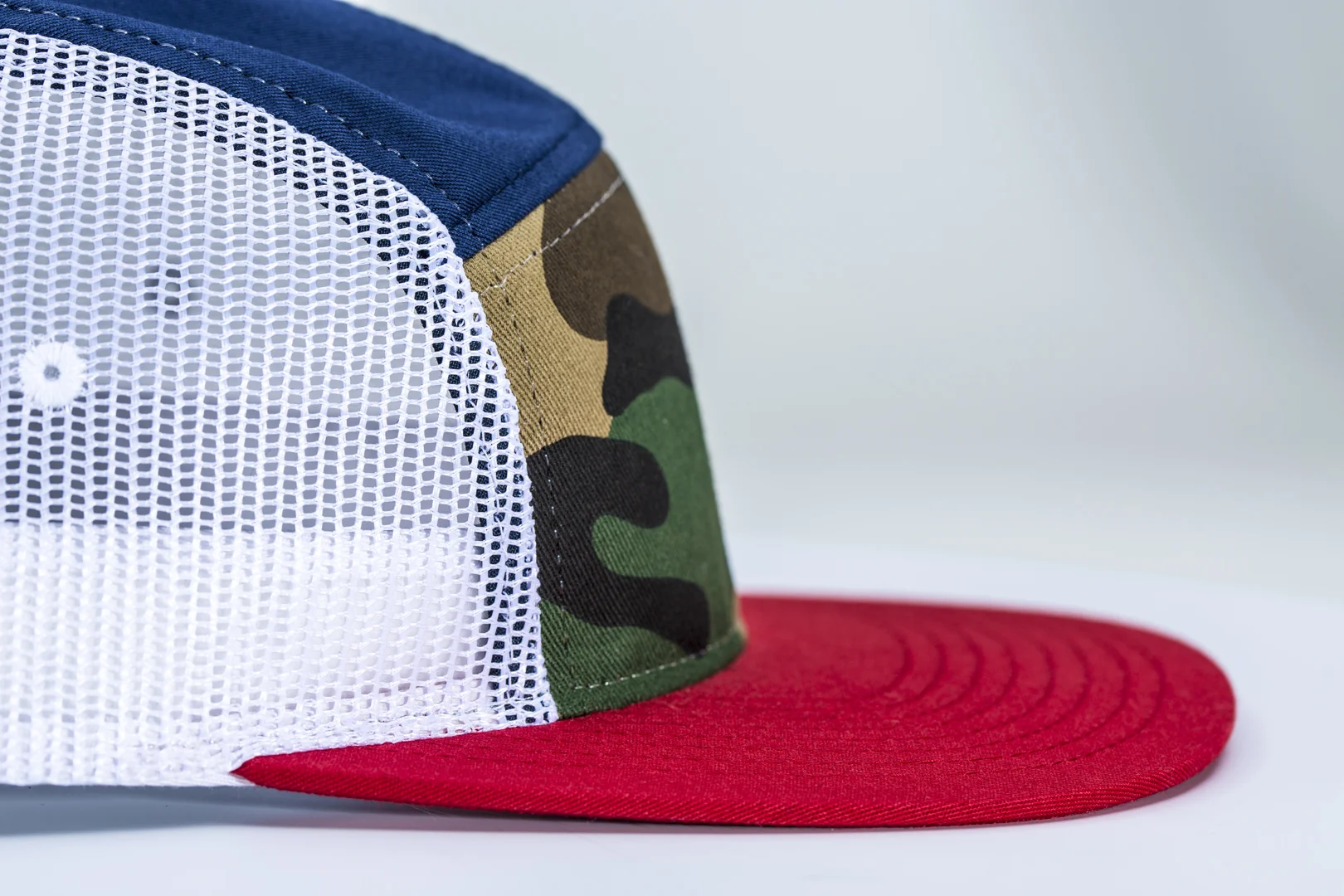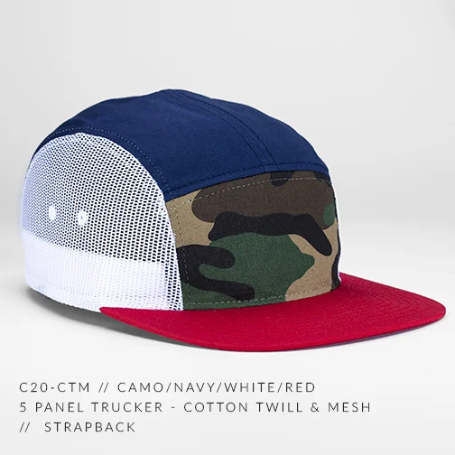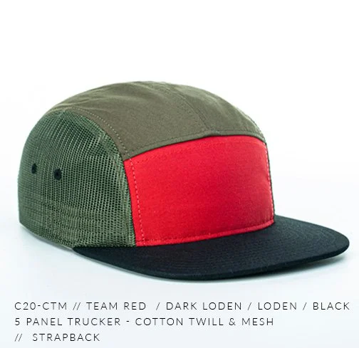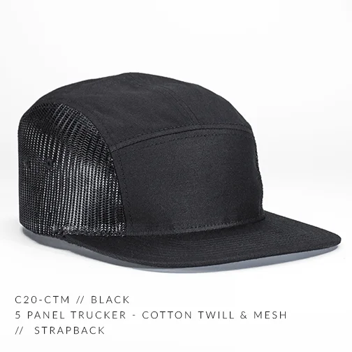 A twist on a classic 5 Panel Camper. A Cotton Twill, Mesh Sided, 5 Panel Trucker Hat with a Flat Bill and Woven Nylon Custom Strapback. Yeah, it's the NEW new.