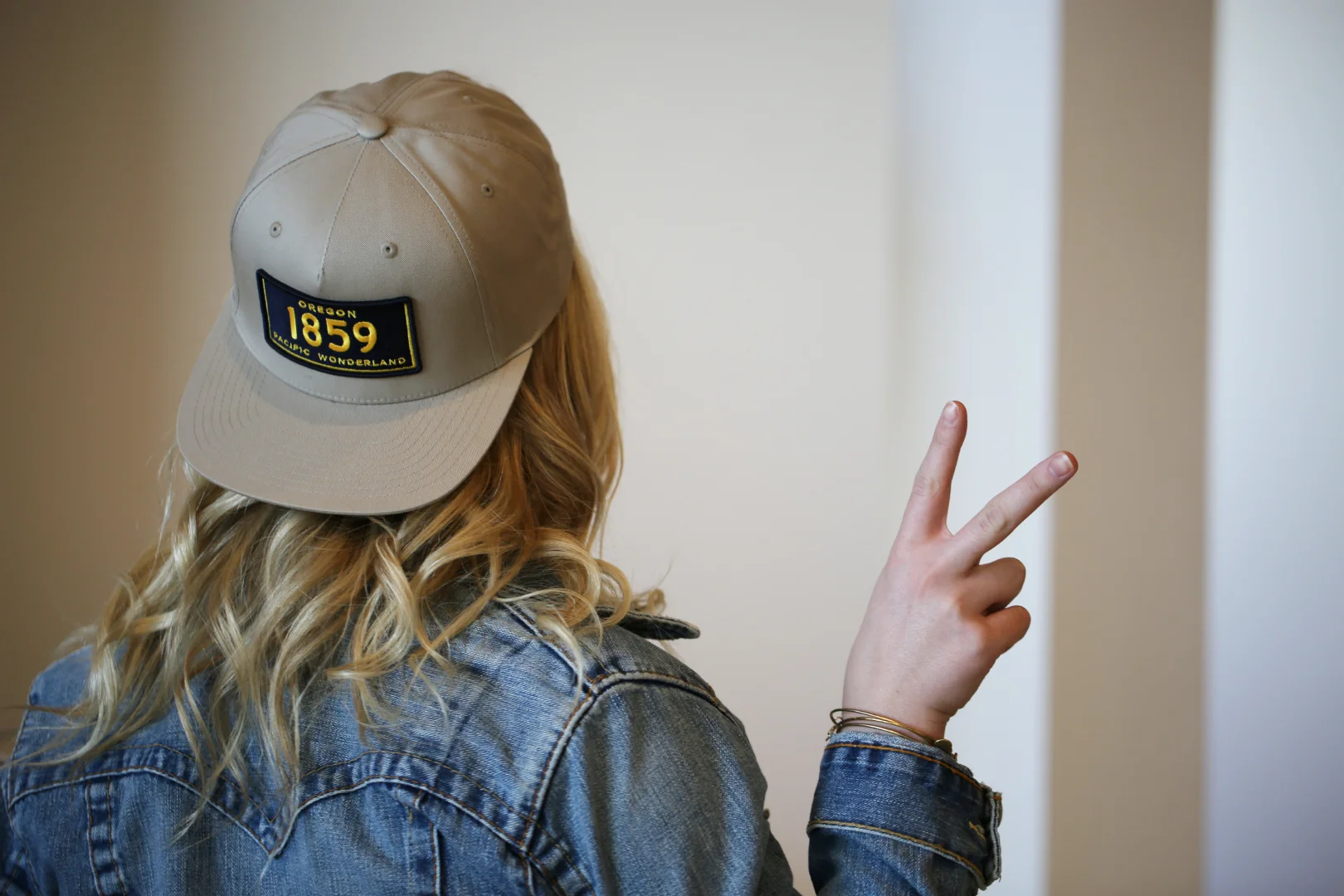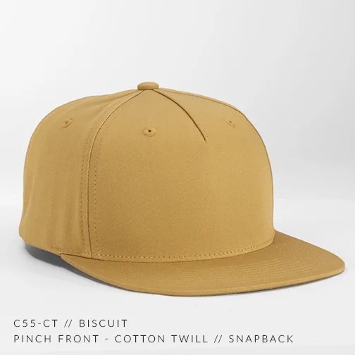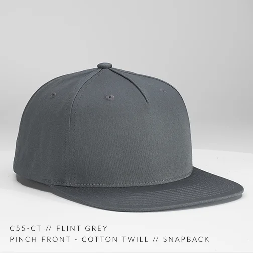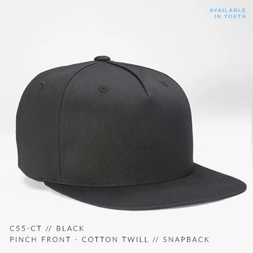 A Custom Cotton Twill, Pinch Front 5 Panel, with a Structured Crown, Flat Bill & Classic Snapback.